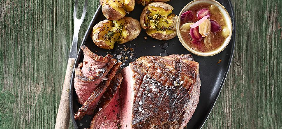 Anret skiver af kalvecuvette med grillede kartofler og druekompot til.