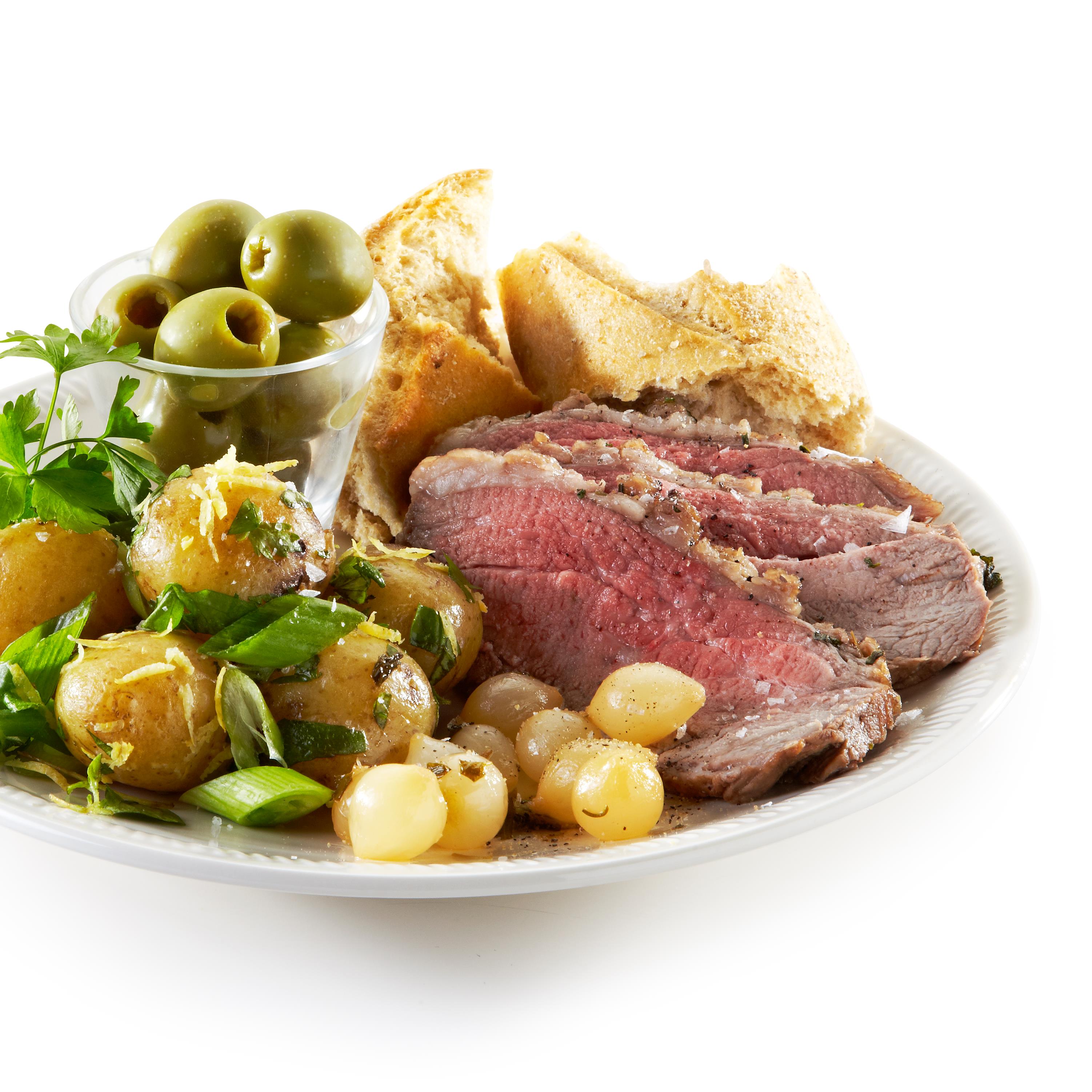 Server cuvetten i tynde skiver sammen med krydderurtekartoflerne, perleløg, groft brød og oliven.