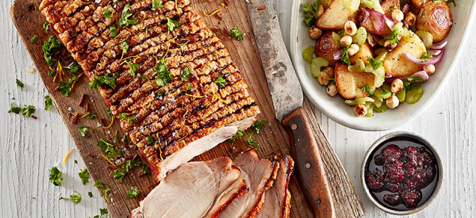 Kam af gris med råstegte kartofler og bærkompot