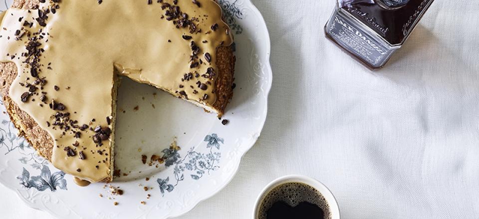 Rør en glasur af kaffe, whiskey og flormelis og hæld over den afkølede kage.