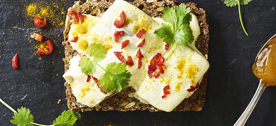 Rør creme fraiche sammen med mayonnaise, karry og mangochutney.