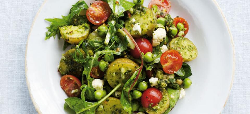 Vend kartofler med rucolapesto efter smag, blomkål, salat, cherrytomater, ærter og fintsnittet forårsløg.