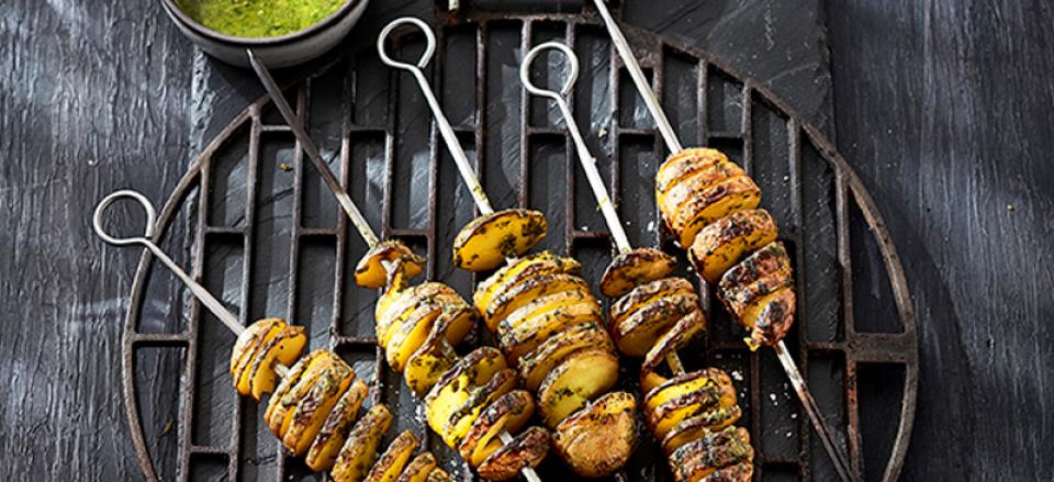 Pensl kartoffelspyddene med lidt olie og grill dem ved indirekte varme til de er gyldne og møre – ca. 25 – 30 min.