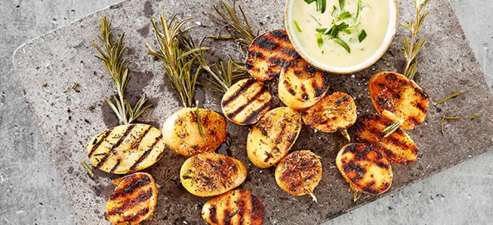 Stik halve kartofler på rosmarinstilkene og grill dem, til de er varme og har tydelige grillstriber.