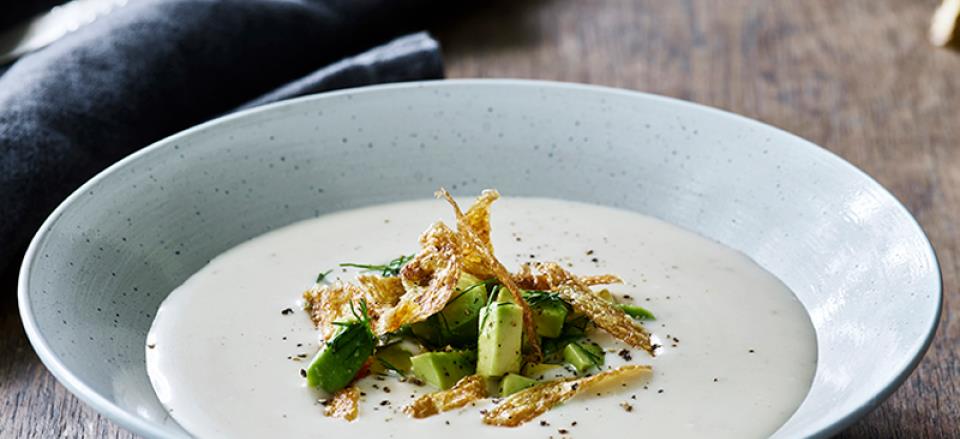 Server suppen med avocadotern og sprøde kartoffelskræller.