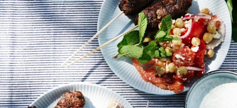 Kebabspyd med myntedressing og tomat- kikærtesalat