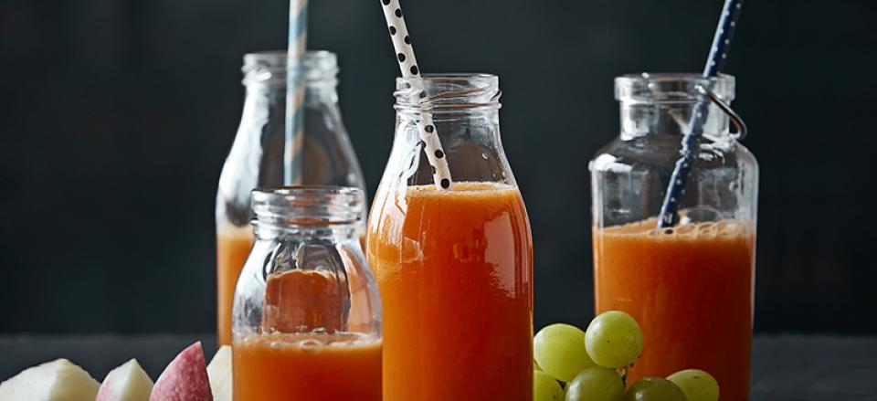 Pil appelsiner, skræl gulerødder og kom det i en juicer sammen med vindruer og æbler.