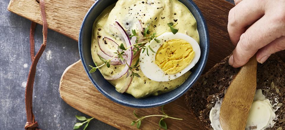 Rør mayonnaise sammen med cremefraiche, karry og gurkemeje.