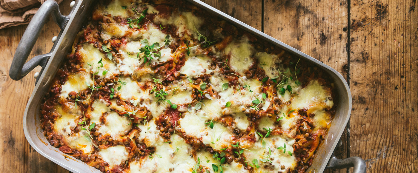Lasagnen afsluttes med et lag linsetomatsauce og herefter mozzarellaost.