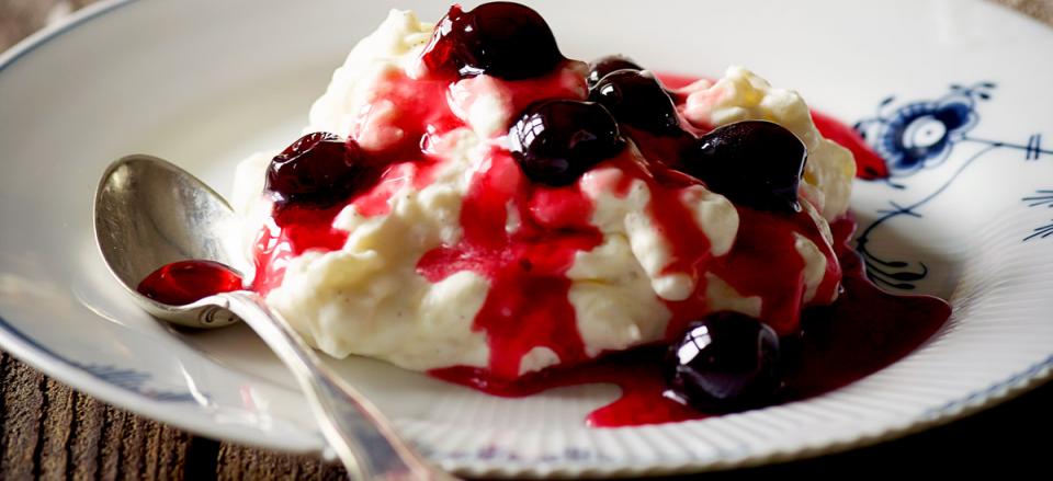 Pisk fløden til flødeskum, vend i den afkølede risengrød og sæt den på køl indtil servering.