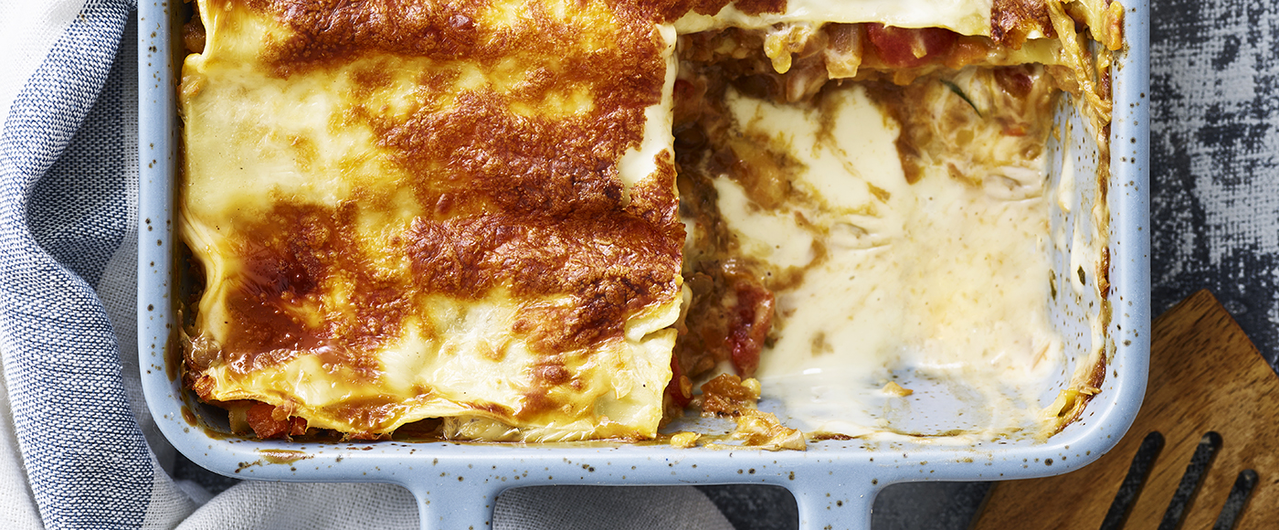 Kom et lag pastaplader på, og kom en tredjedel af linsesaucen på.