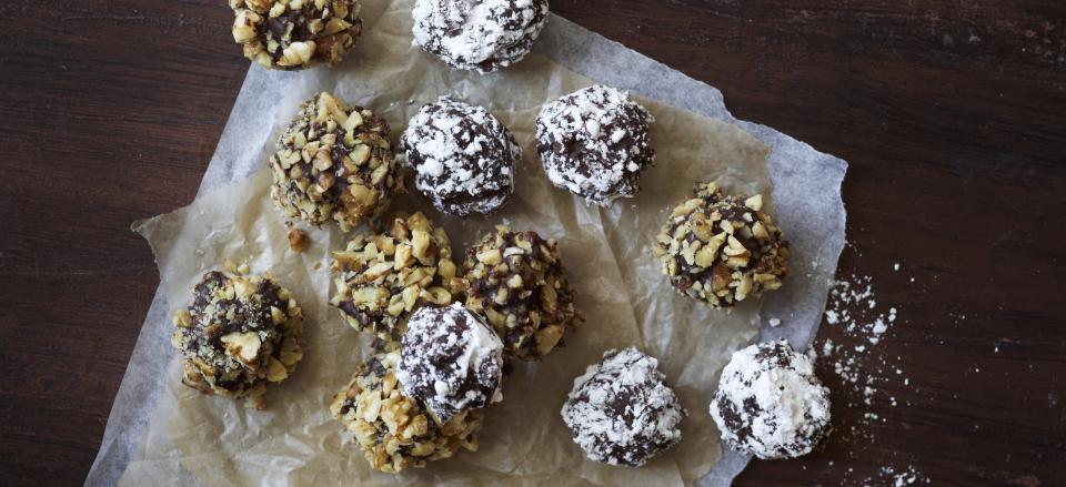 Dyp kuglerne i smeltet mørk overtræk, og tril dem i ristede hasselnødder, ristet kokosmel eller i en blanding af kakao og flormelis, inden chokoladen størkner.