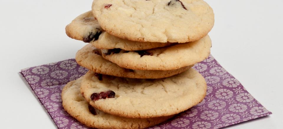 Tilsæt mel, bagepulver, hakket hvid chokolade, tranebær og rør godt.