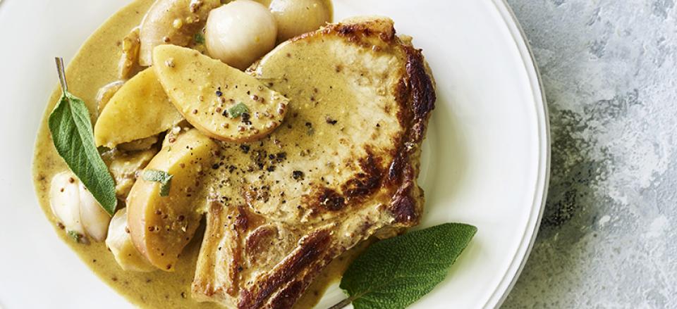 Tilsæt æbler, grofthakket salvie, vand og begge slags sennep, og lad simre i 5 min.