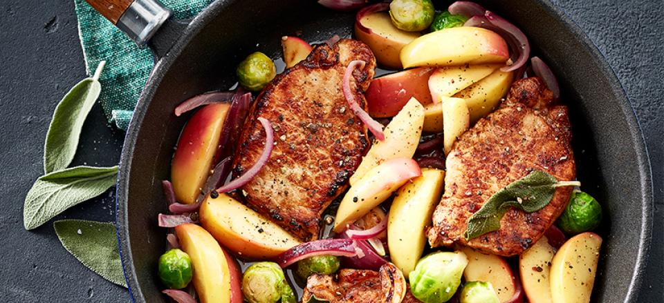 Anret koteletterne med grøntsager og æblemost fra panden.