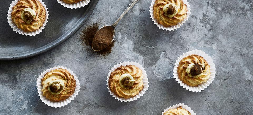 Fyld chokoladeganachen i fordyb-ning-erne i kransekagerne og drys med lakridspulver.