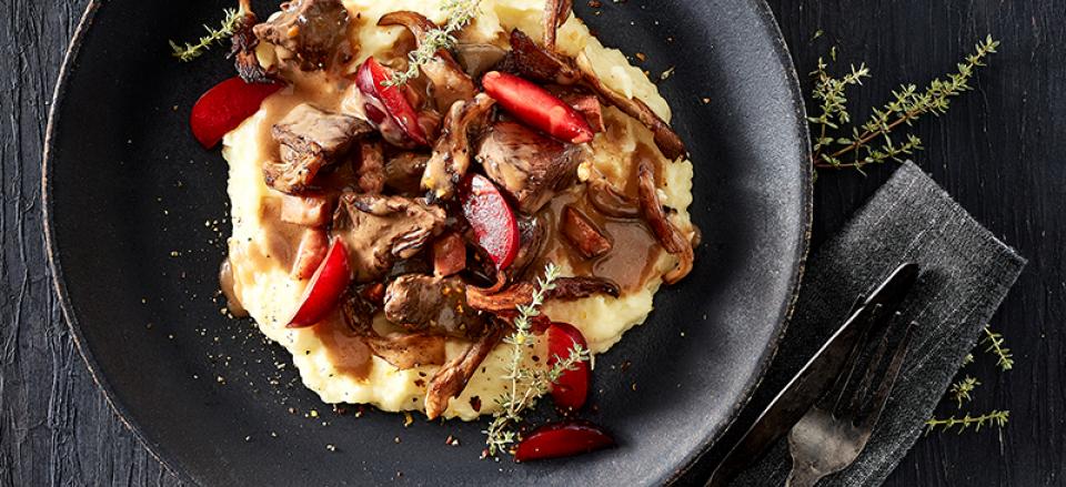 Anret i dybe tallerkener med kartoffel- og sellerimos i bunden, krondyrgryde og top med stegte østershatte, blommer i både og timiankviste.