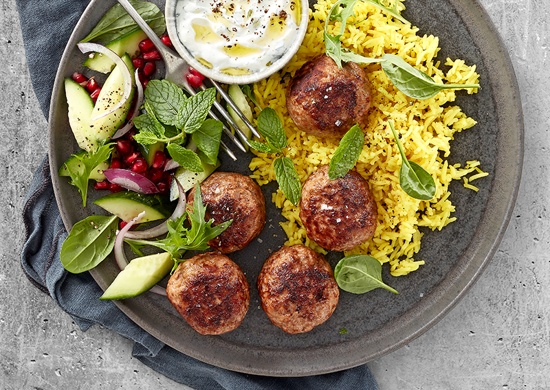 Krydderfrikadeller med gurkemejeris, frisk agurkesalat og yoghurtsauce