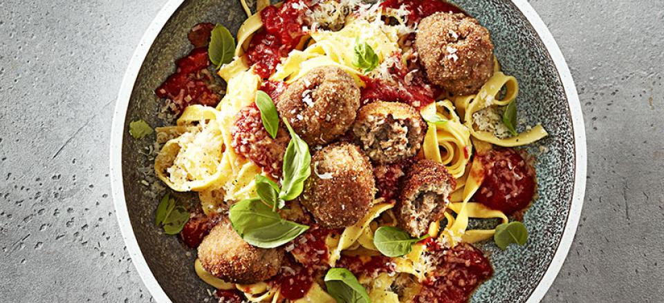 Anret tagliatelle og tomatsauce på en tallerken, og top med 5 krydrede kødboller.