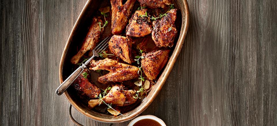 Server anden i fadet og pynt med frisk timian. Server saucen ved siden af.
