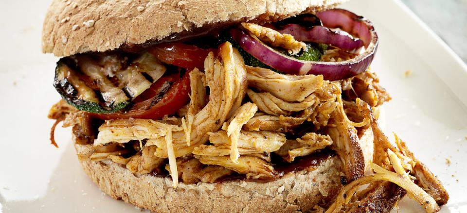 Smør begge sider med barbequesauce og anret på en tallerken med pulled chicken og grillede grøntsager.