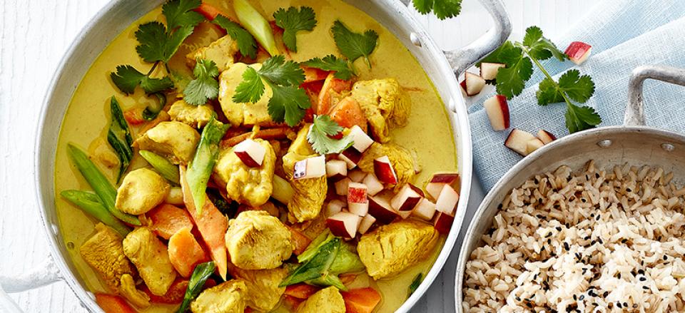 HjemOpskrifterKylling i karry med gulerødder og forårsløg