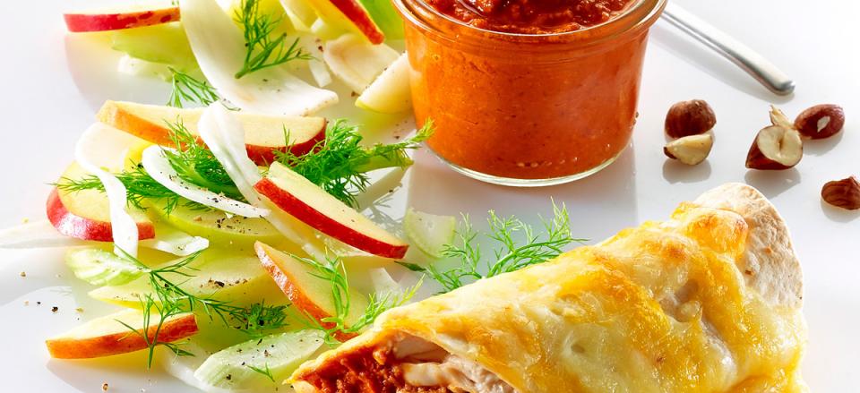 Pil kyllingen og fordel kyllingekødet, ost og 1 spsk. hasselnøddesauce på hver tortilla (gem lidt ost til gratinering).