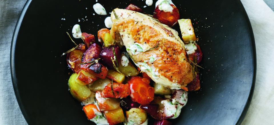 Steg kylling og rodfrugter i ovnen i ca. 30 min. til det er mørt.