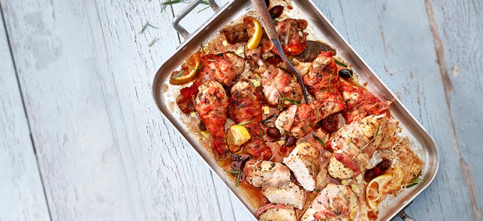 Rul to stykker bacon på hvert kyllingebryst og et stykke bacon på hvert kyllingeunderlår.