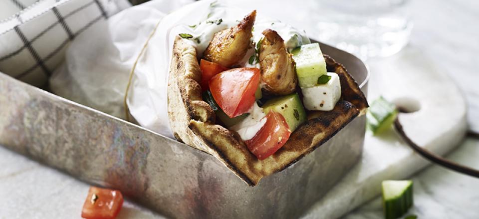 Fyld salat, kylling dressing i pitabrød eller rul brødene omkring fyldet.