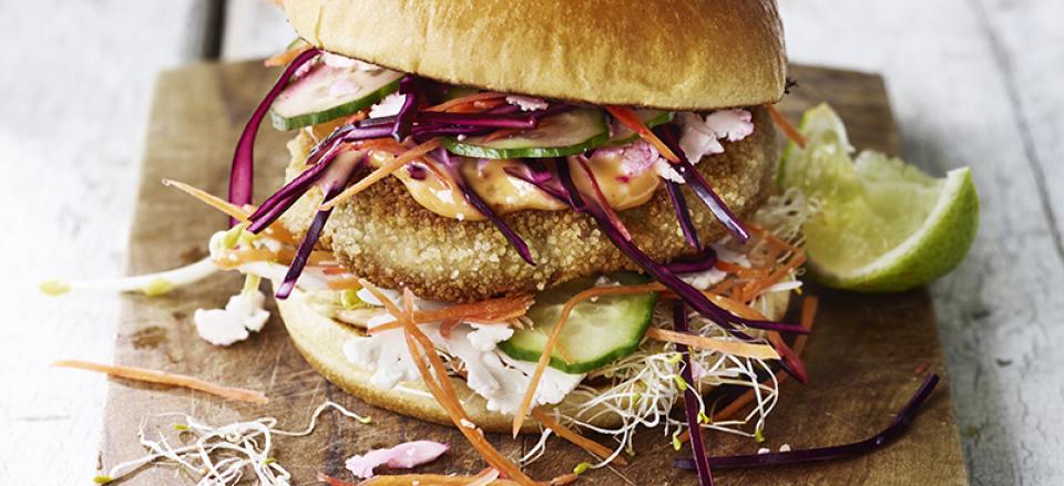 Læg dem sammen med kyllingeburger, spicy mayo, råkost og spirer.