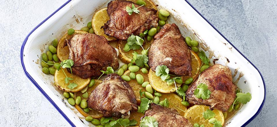 Når der mangler 10 minutter af tilberedningen kommes optøede edamamebønner ved kyllingerne/appelsiner.