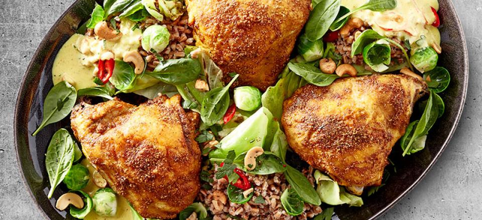 Kyllingeoverlår i spidskål med karry, rosenkål og cashewnødder