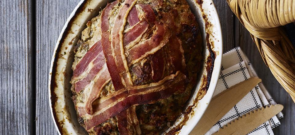 Kom farsen i en postejform på ca. 1 l, og læg 3 skiver bacon på toppen.