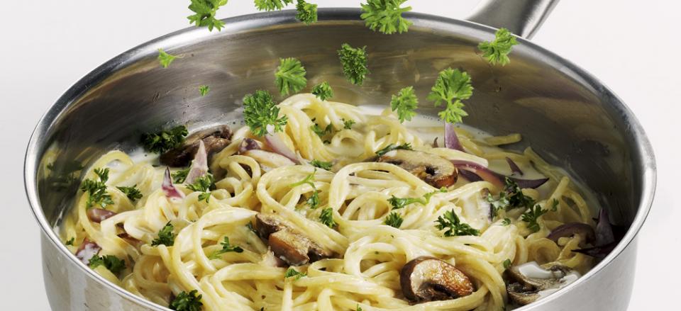 Vend spaghettien i svampene og persillen.