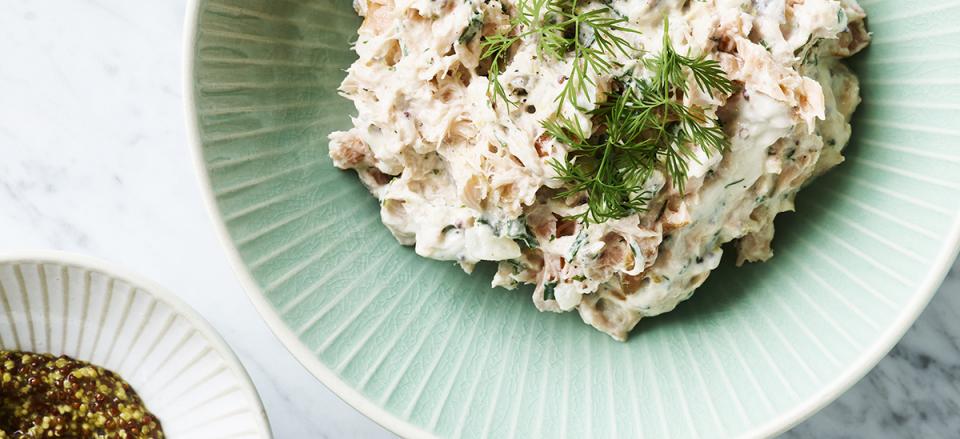 Rør sammen med mayonnaise, creme fraiche, sennep, asier og grofthakket dild og klippet purløg.
