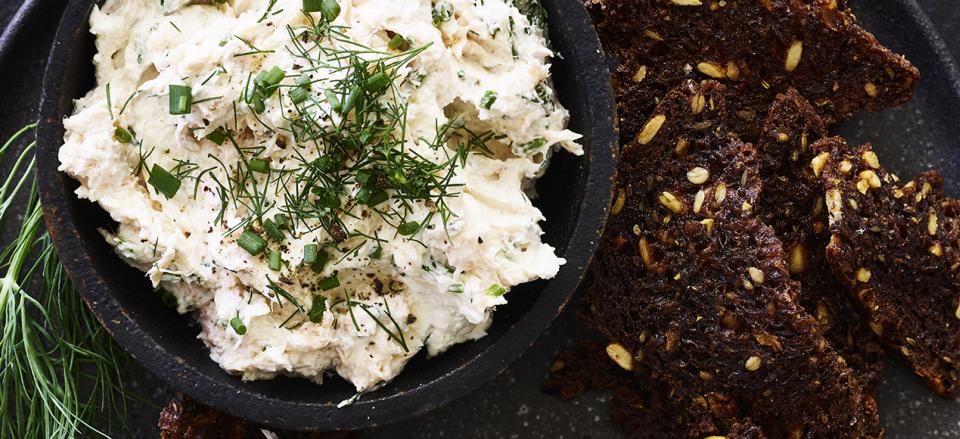Rør laksen sammen med flødeost, purløg og dild, og krydr med lidt peber.