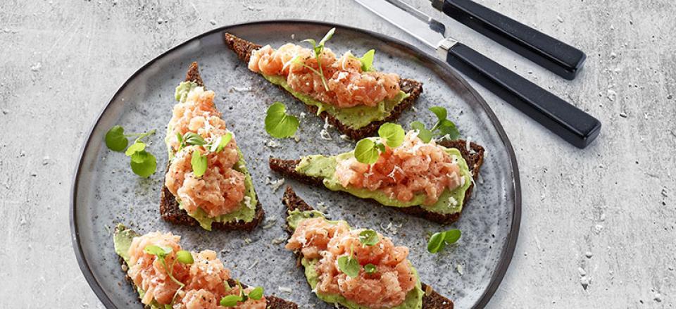 Kom avocadocremen ovenpå det ristede rugbrød og kom derefter laksetataren på og pynt med brøndkarse til sidst.