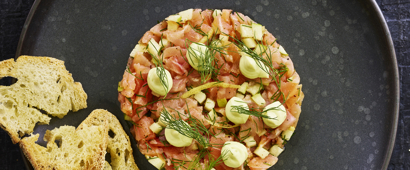 Laksetatar med grønt æble og avocadomayo