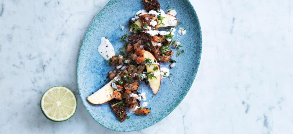 Anret laksetataren med æbler, dressing og ristet rugbrød.