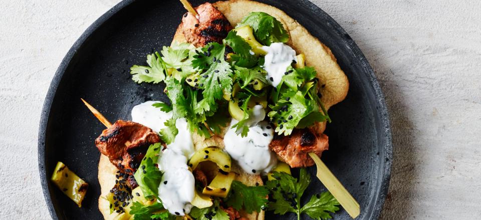 Grill dem ved høj varme, og server dem i naan brød med yoghurt, grillet agurk i skiver og koriander vendt med olie, eddike og sort sesam.