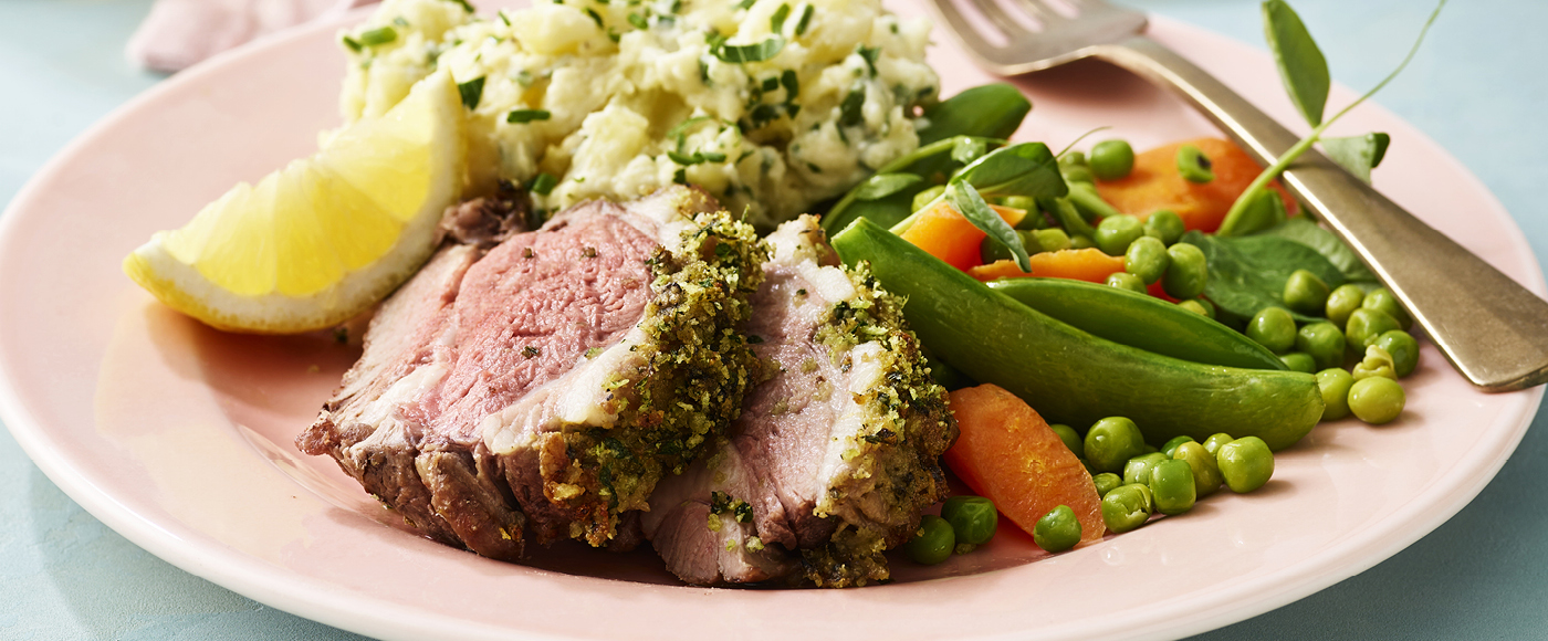 Lammeculotte med kryddercrust, knuste kartofler med urter og smørdampet forårsgrønt
