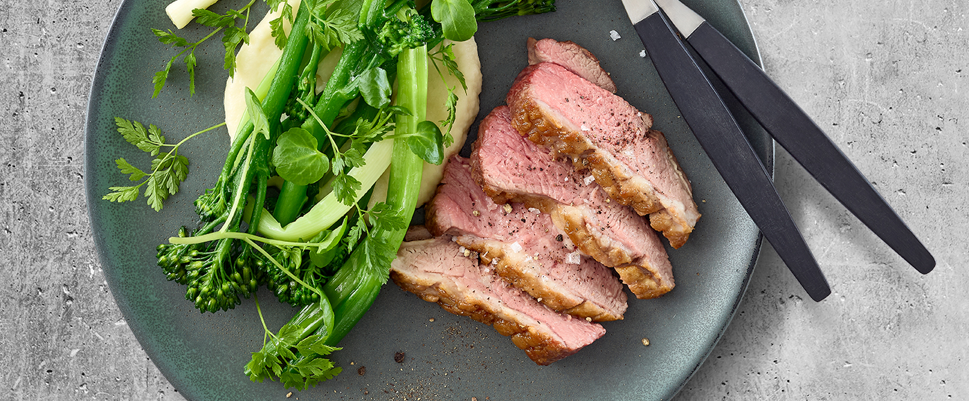 Anret skiver af lammeculotte på den ene side af en tallerken.