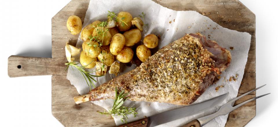 Server lammekøllen med pomme de terre á l'huile.