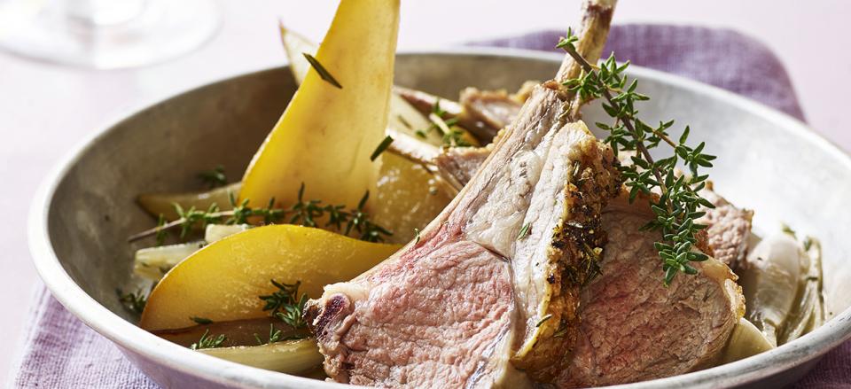 Når løgene begynder at få lidt farve, tilsættes pærer, timian og resten af rosmarinen.