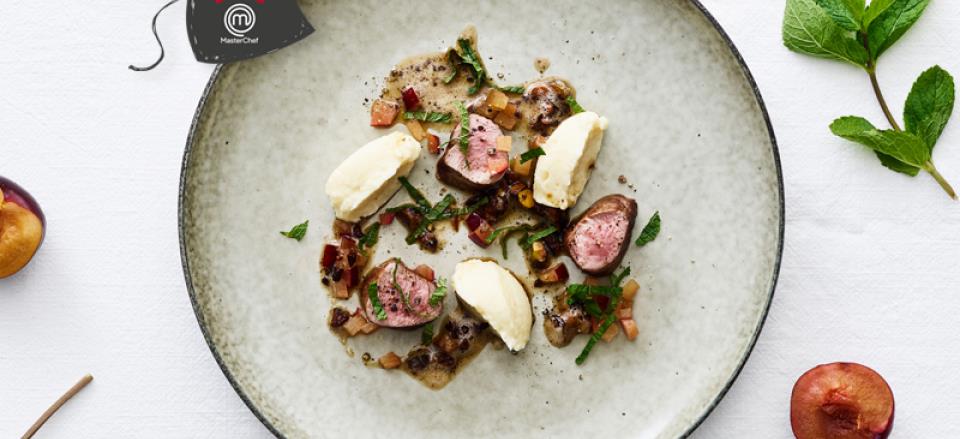 Lammemørbrad med blomme, pistacie og selleripuré