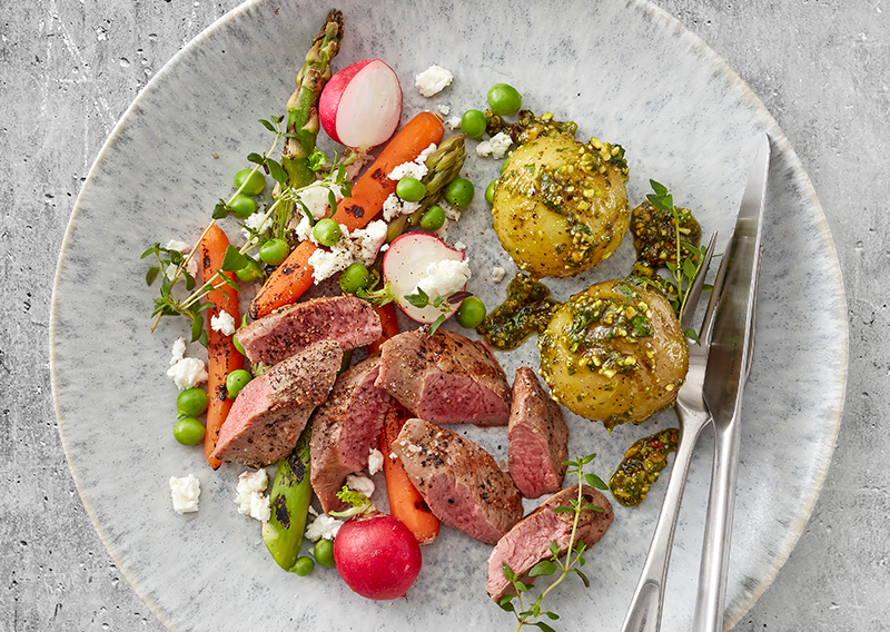 Skær lammemørbraden i skiver. Servér med de kogte nye kartofler vendt i pistaciepesto, grillede grøntsager, radiser og friske ærter. Drys grøntsagerne med fetaost og frisk timian.