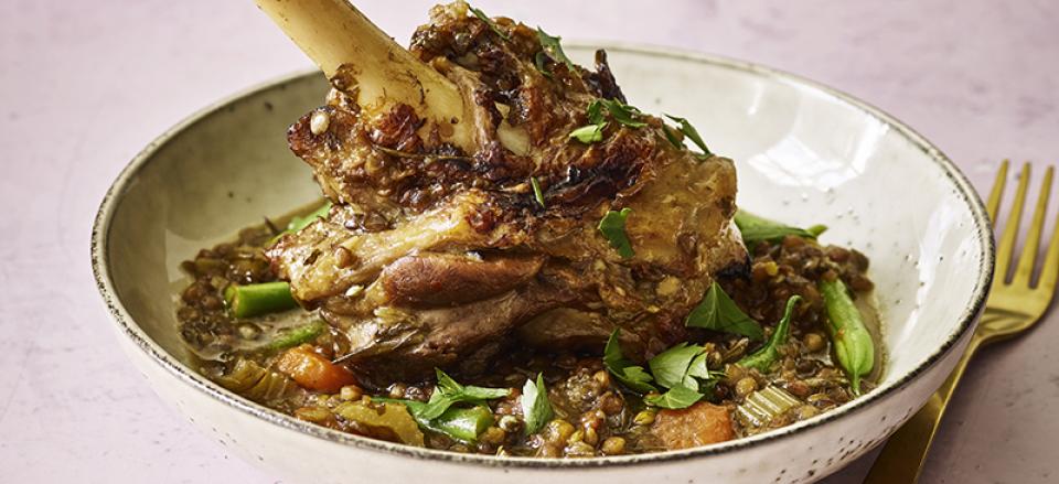 Læg låg på, og lad skankene simre i 1 ½-2 timer, til kødet er helt mørt og næsten falder af benet.