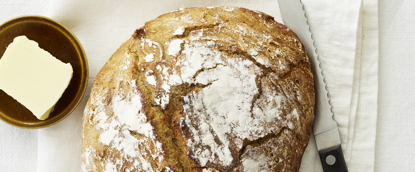 Tag den forsigtigt ud af ovnen, og drys groft mel i bunden, så brødet ikke klistrer fast.