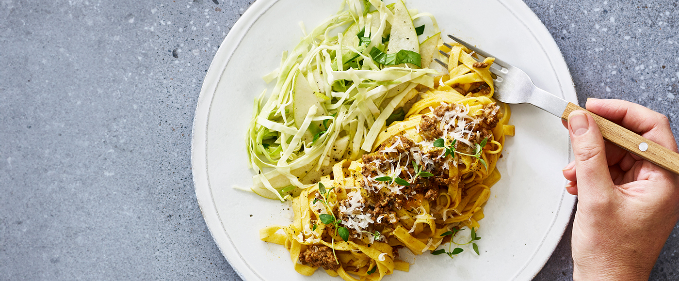 Langtidssimret bolognese og spidskålssalat med pære